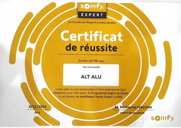 ALT Aluminium est certifiée Somfy Expert, une distinction réservée aux installateurs professionnels formés aux technologies Somfy. Cette certification garantit à nos clients des installations fiables, performantes, motorisées et entièrement connectées, assurant ainsi un usage confortable, sécurisé et moderne de leurs volets roulants et systèmes automatisés.